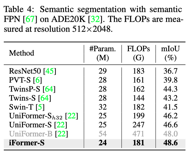 在上表中,作者报告了不同主干网络的 mIoU 结果。在语义 FPN 框架上,本文的 iFormer 在这项任务上始终优于以前的主干,包括 CNN 和(混合)VIT。