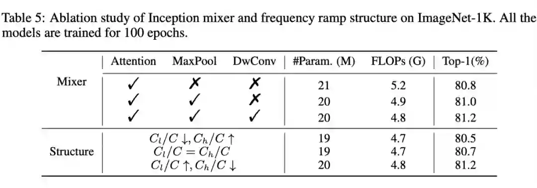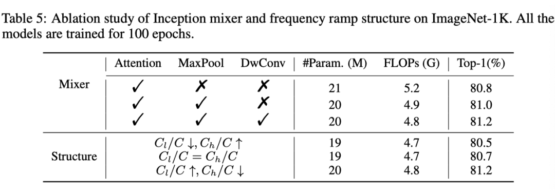 在上表中,可以看出将注意力与卷积和最大池化相结合,可以比仅注意混合器获得更好的精度,同时使用更少的计算复杂性,这意味着 Inception Token Mixer.的有效性。此外,表格中下半部分的结果证明了,频率斜坡结构的合理性及其在学习辨别性视觉表征方面的潜力。