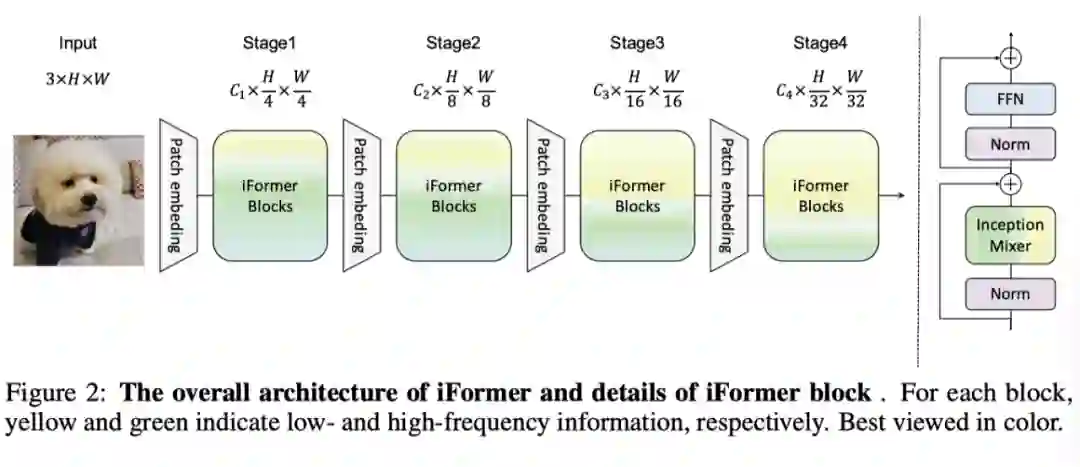 为了解决这个问题,作者提出了一种简单有效的 Inception Transformer(iFormer),它将 CNN 捕捉高频的优点移植到 ViT 上。iFormer 中的关键组件是 Inception token mixer。该 Inception mixer 旨在通过捕获数据中的高频和低频来增强 VIT 在频谱中的感知能力。