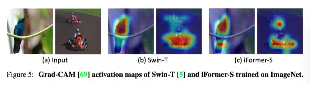 在上图中,作者可视化了 ImageNet-1K 上训练的 iFormer-S 和 Swin-T 模型的 Grad-CAM 激活图。可以看出,与 Swin 相比,iFormer 可以更准确、更完整地定位对象。例如,在蜂鸟图像中,iFormer 跳过树枝并准确地关注整个鸟,包括尾巴。