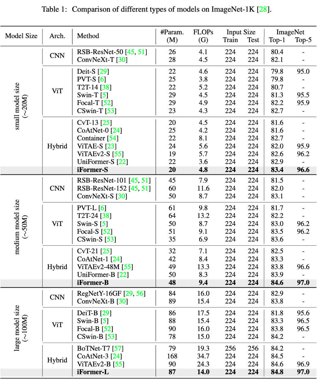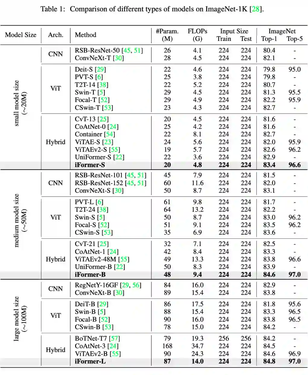 作者在一系列视觉任务中对 iFormer 进行了基准测试,并展示了它在图像分类、COCO 检测和 ADE20K 分割方面取得的惊人的性能。例如,iFormer-S 在 ImageNet-1K 上达到了83.4% 的 Top-1 精度,比 DeiT-S 高出了 3.6%,甚至比更大的 Swin-B(83.3%)略好,只有 1/4 的参数和 1/3 的 FLOPs。