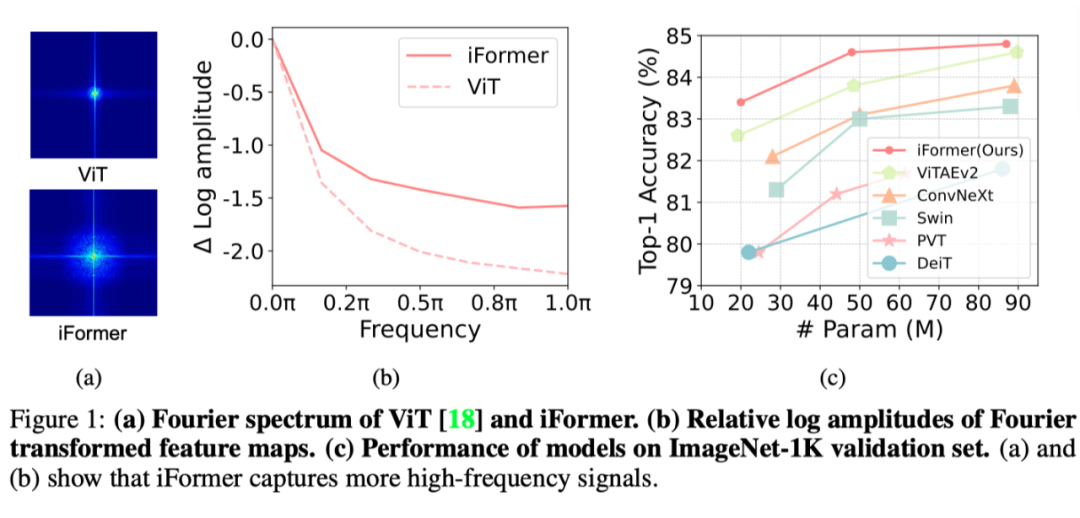 如图 1(a)和 1(b)所示,傅里叶频谱和傅里叶的相对对数振幅表明,ViT倾向于很好地捕捉低频信号,但很少捕捉高频信号。这表明ViT呈现出低通滤波器的特征。这种低频偏好性会损害 VIT 的性能,因为:1)所有层中的低频信息填充可能会恶化高频成分,例如局部纹理,并削弱 VIT 的建模能力;2) 高频信息也是有区别的,可以帮助完成许多任务,例如(细粒度)分类。