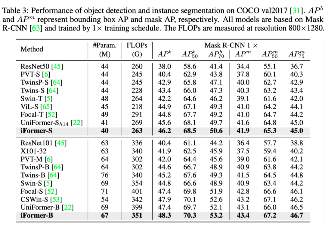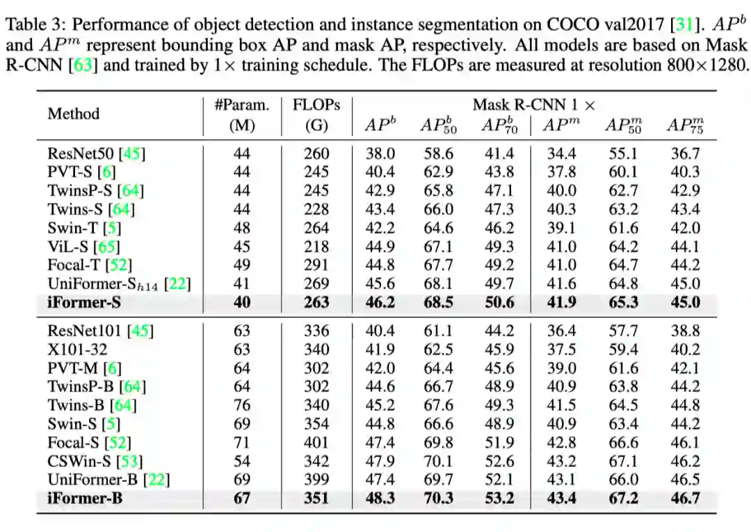 上表报告了比较模型的 box mAP 和 mask mAP。在类似的计算配置下,iFormers 的性能优于以前的所有主干网。