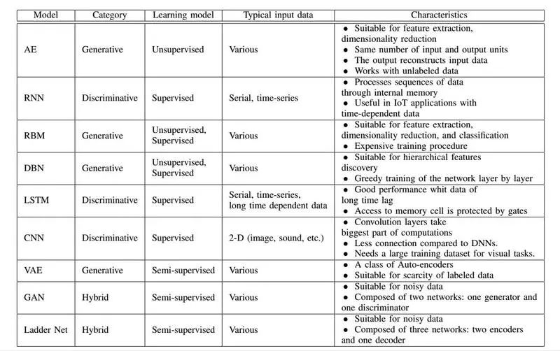 作者对于目前应用了深度学习方法的大量 IoT 应用进行了介绍,并且对不同类型的深度神经网络在各种 IoT 领域的应用进行了概括和对比。