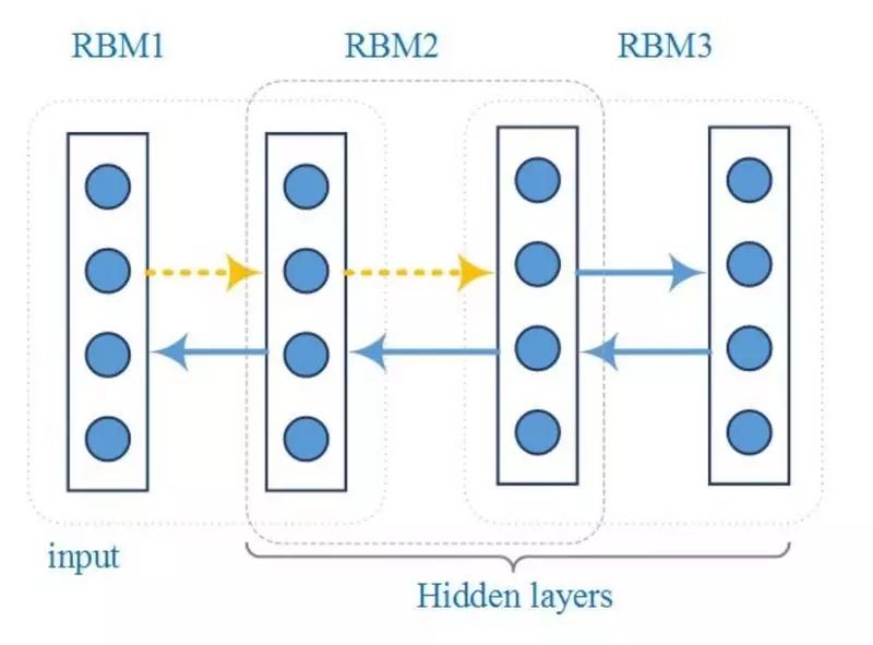 深度信念网络结构图。虚线表示特征提取通道,实现表示生成通道。DBN 是一种生成神经网络,由一个可见层可几个隐层组成。可以提取训练数据的多层表示,并且对输入数据进行重构。DBN 的训练过程是逐层训练,将每一层视作一个 RBM,在前一层的基础上进行训练。这样的机制使 DBN 成为深度学习中有效且快速的网络之一。