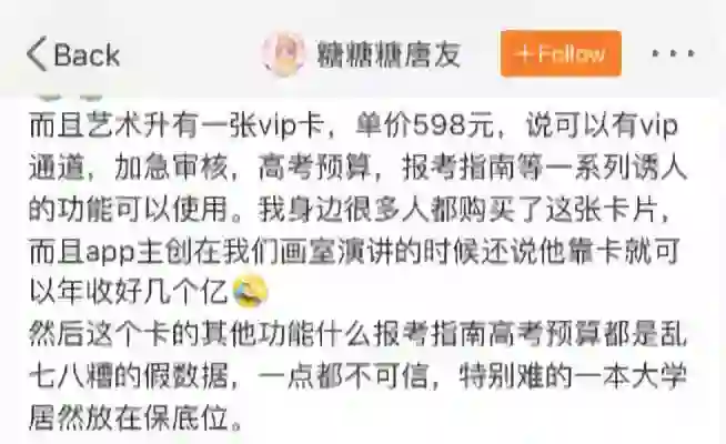小唐说,艺术升VIP卡的报考指南和高考预算,全都是假数据。