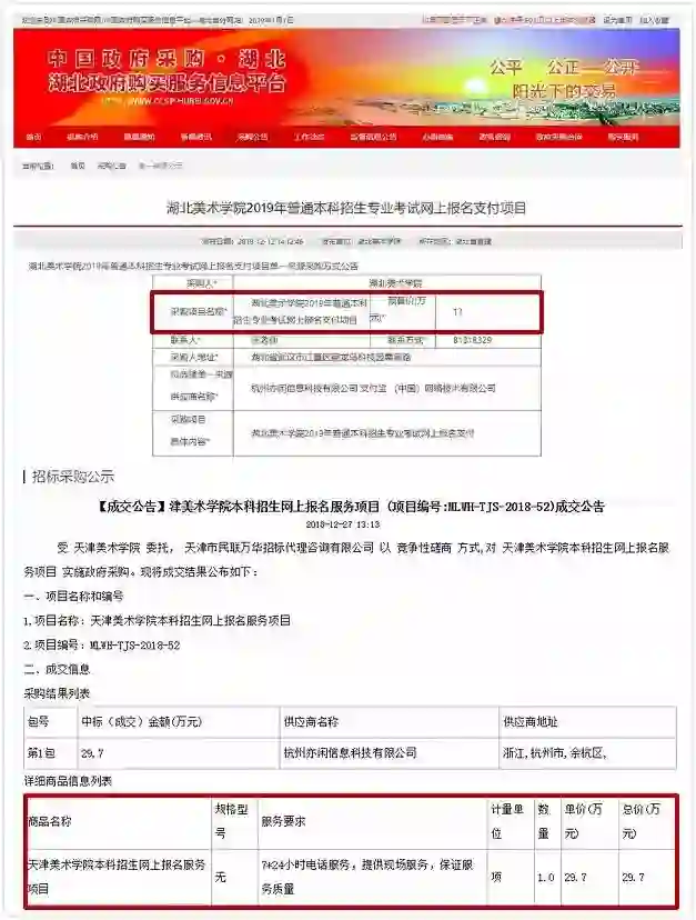 我们可以在湖北美术学院和天津美术学院的官网,查到他们招标的情况。