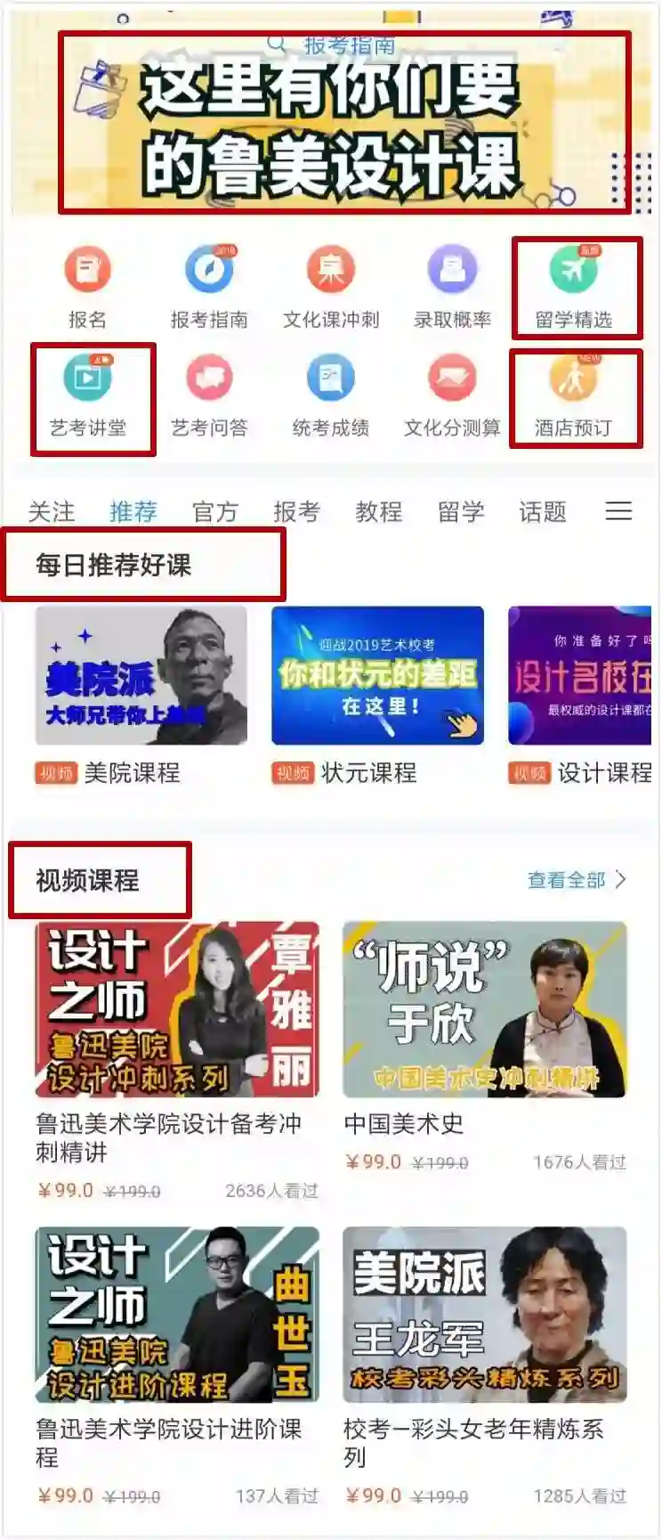 更不用说,艺术升这个APP里,到处充斥着课程、画室、酒店、留学各种广告。
