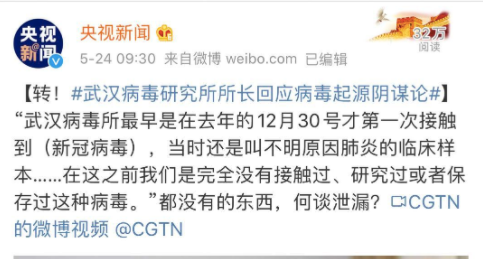 5月24日,武汉病毒所所长王延轶回应新冠病毒相关问题称,“武汉病毒所最早是在去年的12月30号才第一次接触到(新冠病毒),当时还是叫不明原因肺炎的临床样本……在这之前我们是完全没有接触过、研究过或者保存过这种病毒。”都没有的东西,何谈泄漏?(央视新闻)