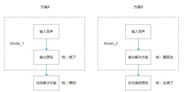 现实中“啼哭原因”与“解决方案”是多对多的复合因果关系,如果直接取哭声+有效方案来拟合模型,可能最终效果相同甚至更好。