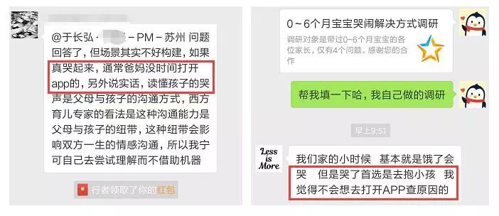 一位家长说没时间,想靠自己沟通情感读懂宝宝;另一位家长说想不到用APP,他家宝宝特别乖,从未久哭不停——这就涉及到用户理念、习惯、个体差异的问题了,三言两语还真说不清楚。
