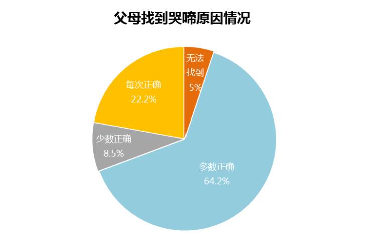 覆盖度:调研中设定的9种原因已经覆盖了95%的情况,排名最高的6种是饥饿口渴、尿布湿、要抱抱、困了、疾病和疼痛。另有5%的父母选择了其他原因,包括受到惊吓、身体被挤压等,这些原因可以通过一进步的调研来补全。