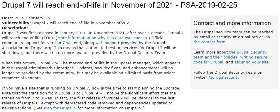 Drupal Association 宣布, 2011年1月释出的 Drupal 7 将到2021年11月结束支持,这意味着 Drupal 安全团队将不会继续为 Drupal 7 核心或模块、主题等提供安全更新,暴露出来的新漏洞将不太可能得到修正。