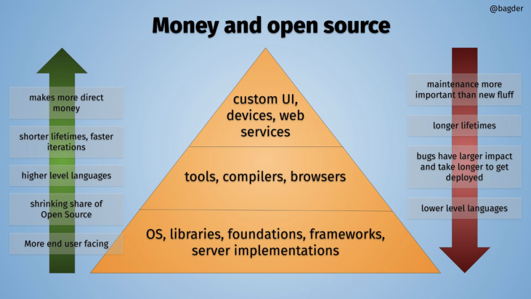 越往上走,产品更多是面向终端用户,企业能赚更多的钱,同时产品迭代更快、语言要求层次更高,开放源码的份额也不断减少。在最上面,很多东西已经不是开源的了。反之,越往下走,产品使用寿命更长,语言要求不好,但 bug 的影响更大,修复需要的时间更长,因此维护比重构更重要。在最底部,几乎所有的东西都是开源的,每个组件都被无数的用户所依赖。