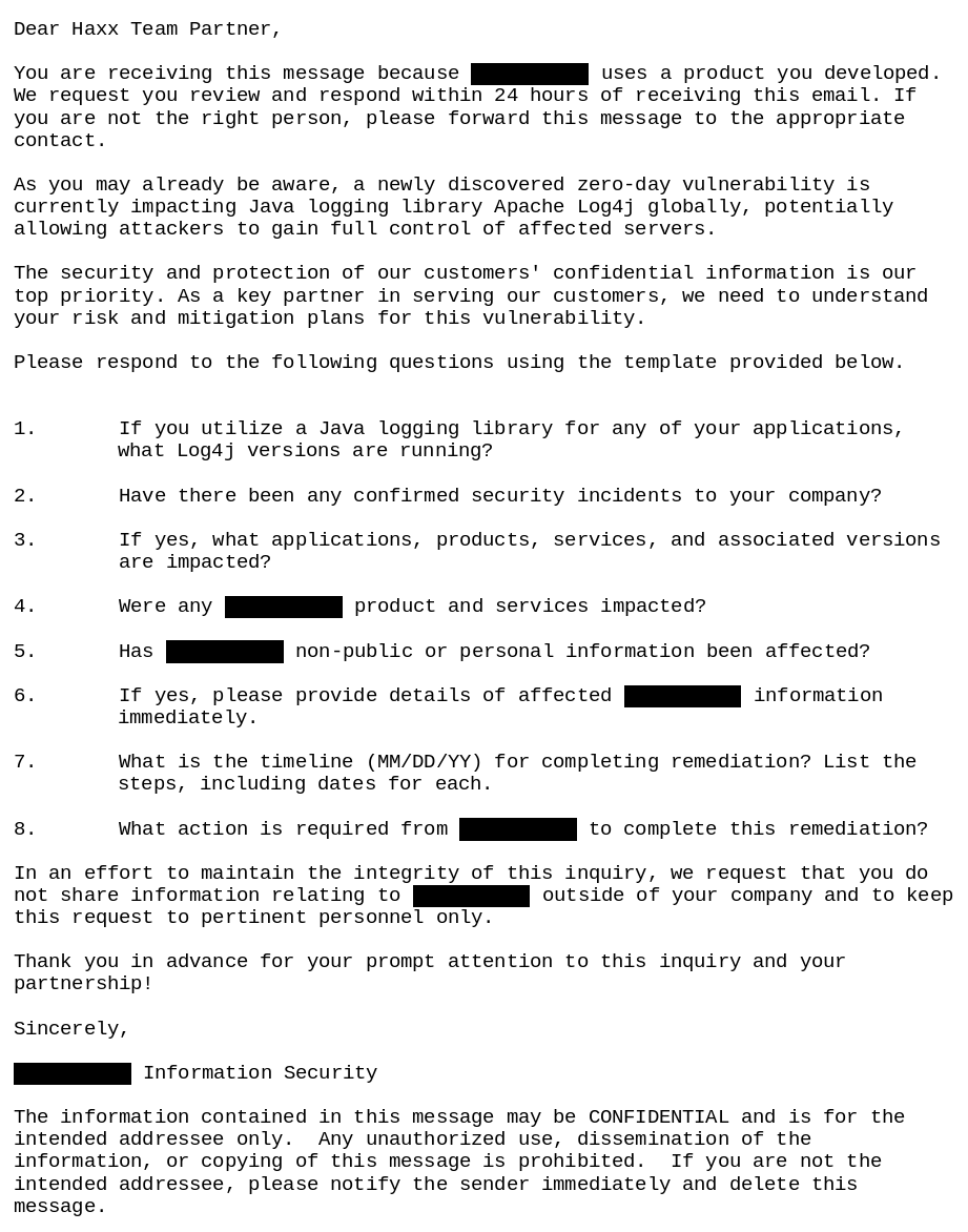 根据公开的邮件内容,这家《财富》500 强企业(暂且称为“NNNN”)将 Daniel 团队当成了产品供应商,并要求其 24 小时内免费提供关于 Log4j 漏洞的解决方案。下面是 NNNN 要求 Stenberg 回答的问题: