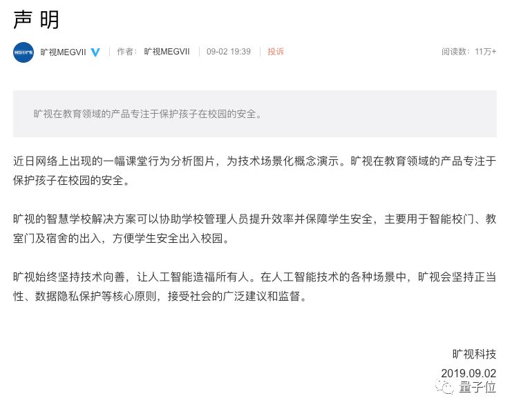 旷视在官方回应中说,自己在教育领域的产品专注于保护孩子在校园的安全。