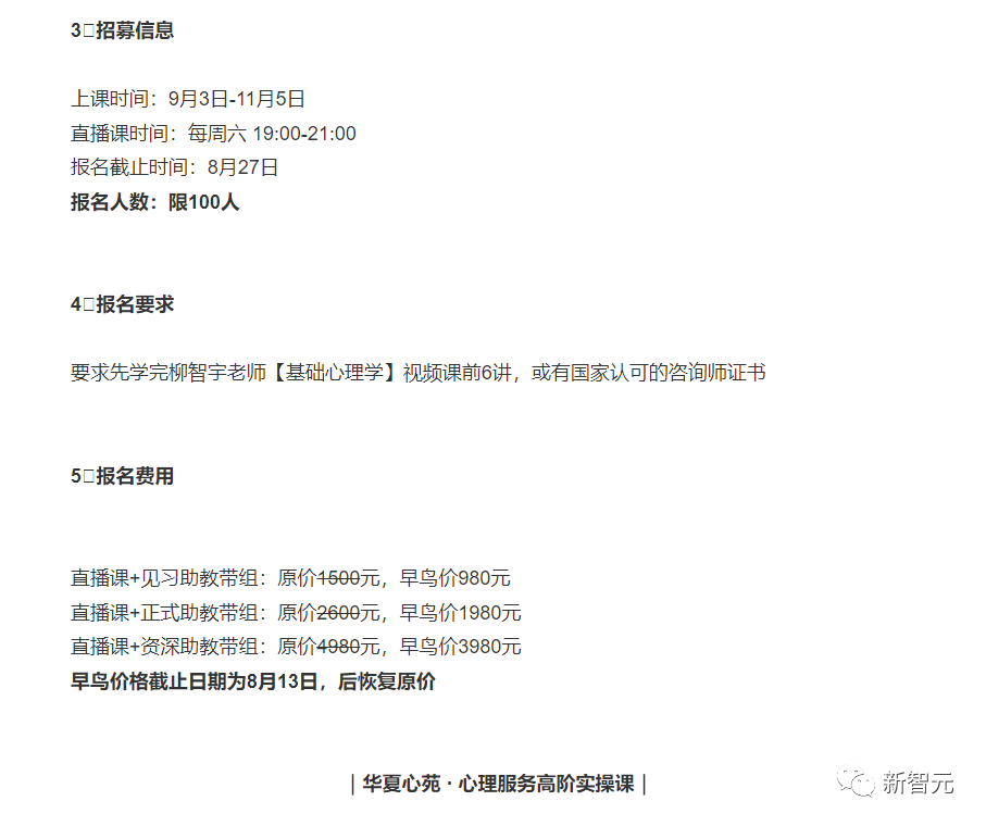 蓝鲸财经记者报道称,该系列课程为网络直播课程,其中包含直播课8次,小组练习8次,每次2小时,报名费用从980元到4980元不等。