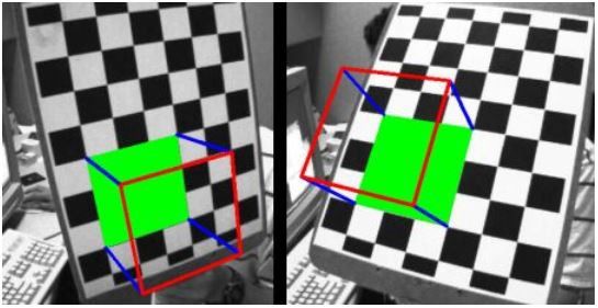 def draw(img, corners, imgpts):imgpts = np.int32(imgpts).reshape(-1,2)# draw ground floor in greenimg = cv2.drawContours(img, [imgpts[:4]],-1,(0,255,0),-3)# draw pillars in blue colorfor i,j in zip(range(4),range(4,8)):img = cv2.line(img, tuple(imgpts[i]), tuple(imgpts[j]),(255),3)# draw top layer in red colorimg = cv2.drawContours(img, [imgpts[4:]],-1,(0,0,255),3)return img