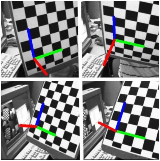 如下图,我们看到四张不同棋盘图像被我们程序处理后的结果。