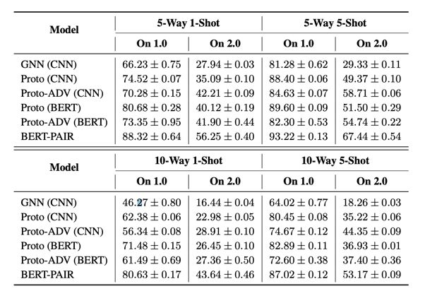 ▲ FewRel 1.0和FewRel 2.0测试结果对比,可看出跨领域任务十分具有挑战性