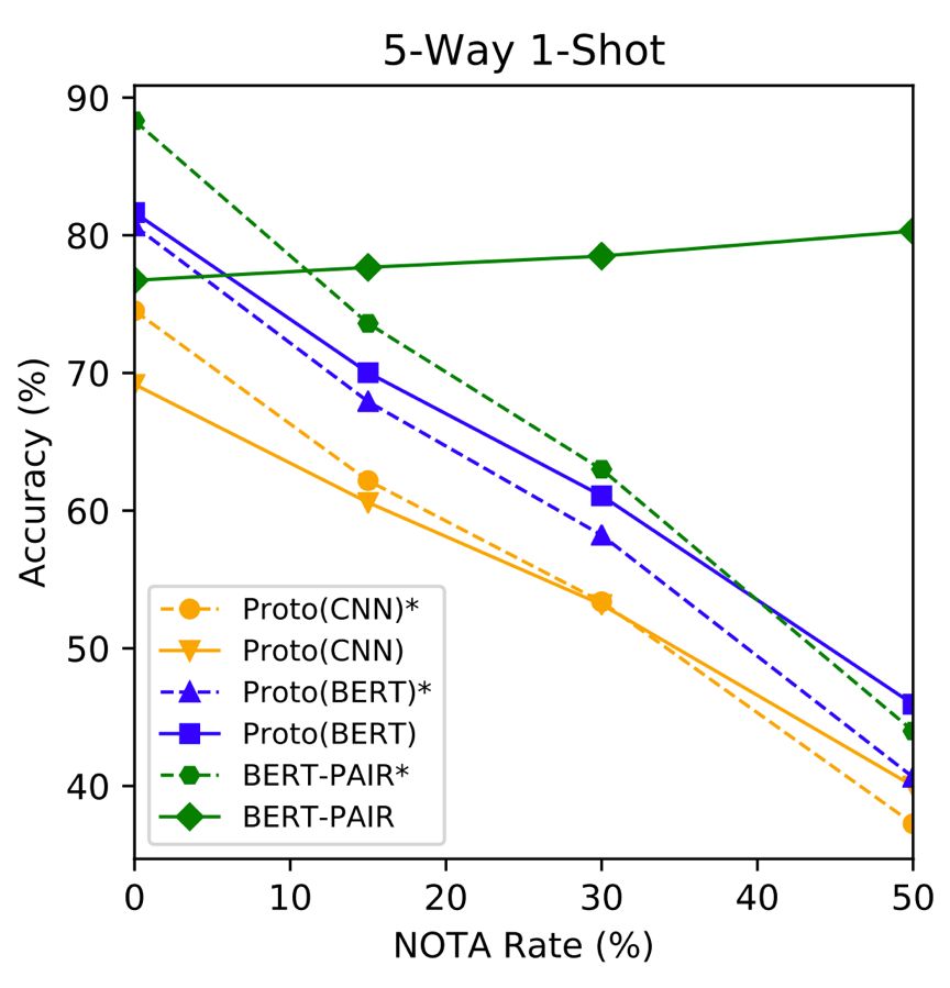 在 FewRel 2.0 中,作者提出了两大少次学习新挑战:跨领域和“以上都不是”(无答案问题)。作者表示,以往的少次学习模型都不能很好的解决这两大问题,虽然他们提出了两个新模型,效果得到了一定的改善,但在这两个挑战上,仍有巨大的上升空间。
