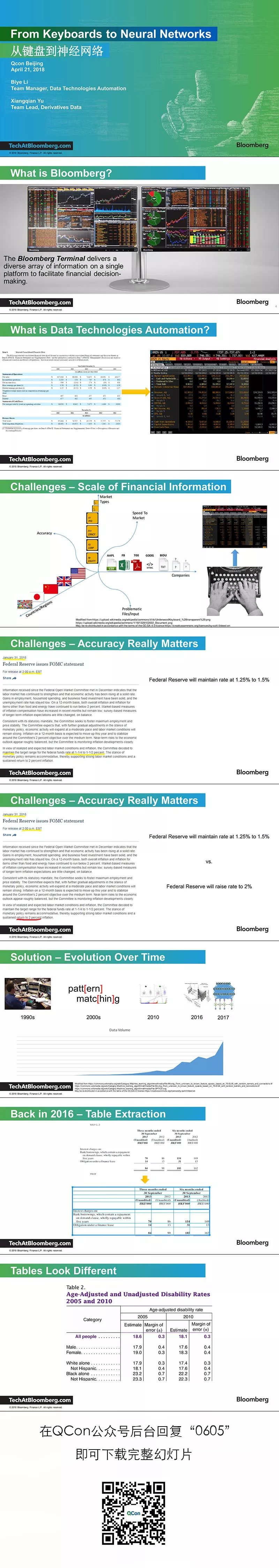 在金融数据领域,彭博用三十多年的时间从一个向用户提供部分美国公司金融数据的公司成长到了现在覆盖全球基本上所有公司的全方面的超大型集成平台。这些金融数据都需要从不同的格式中被尽可能快速并且准确的提取出来,标准化,最后通过统一的格式反馈到市场。在本次演讲中,我们讲述了在神经网络领域最新的突破如何帮助彭博对文件进行自动化处理,并展示了其在数据提取及分析方面体现出来的更高准确度和更快处理速度。