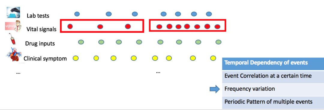 我们首先需要分析医疗事件数据特点以及性质。电子病历记录可以抽象成上千种带有时序信息相互关联的医疗事件,不仅上千种事件之间有不同的记录频率,相同类型的事件由于其事件属性不同,也有很大差异。比如药物注射事件就包含药剂类型、剂量、注射速率三个属性;化验事件的属性包括化验异常与否、指标的值这两个属性。