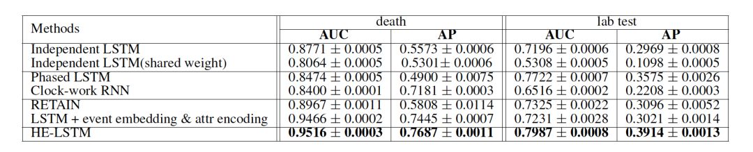 在死亡预测和钾离子化验异常预测任务中,相比于单独对各个数据源进行序列建模的模型和延迟更新的RNN模型,以及异构序列模型,异构事件LSTM(HE-LSTM)在AUC和AP上都有更好的表现。