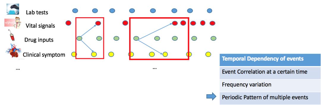 而我们的思路不是以病例的数据形式做最初的划分依据,而是以医疗过程中的事件为基本单位,保留精确的事件发生时间,进行建模的。这样可以更大程度地保留和反映各个事件之间的关系,以及不同事件发生的频率结构。