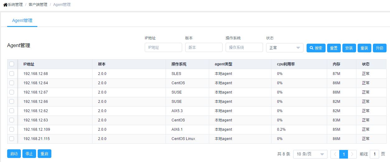 两者搭配部署,可覆盖不同的实施环境要求。平台提供了统一管理Web界面,以方便批量安装和升级,针对不同的系统能做到一键部署、一键安装、一键启停和重启。大大提高了管理效率。