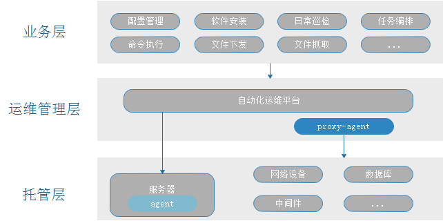 整合后的自动化运维平台分为三层:业务层、运维管理层、托管层,如下图: