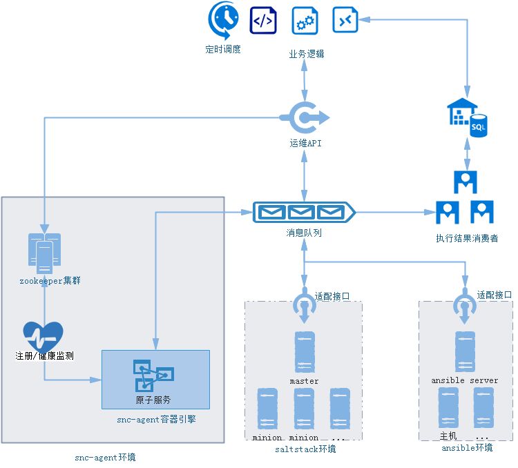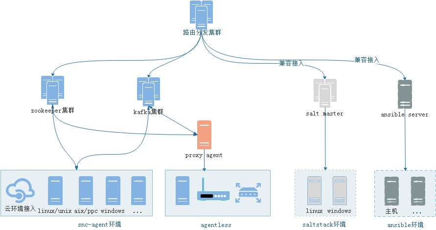 除了兼容Ansible和SaltStack环境外,增加了snc-agent集群环境,用于弥补SaltStack在非主流系统支持上的不足。