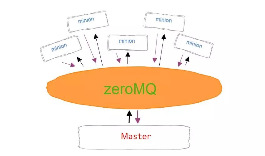 SaltStack的异步执行模式可以很好地应对上千台设备(甚至更多)的任务执行,特别适合耗时场景的应用。下面是SaltStack的简单通信架构图: