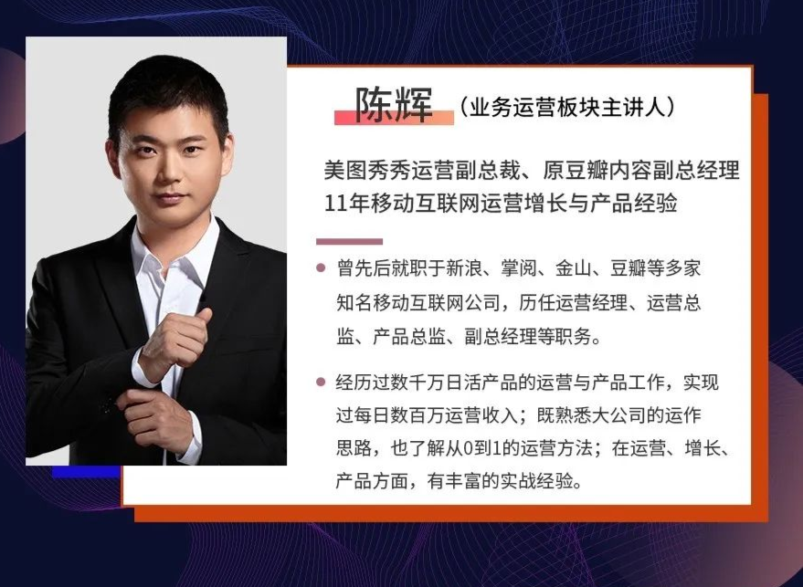 特邀美图秀秀运营副总裁、原豆瓣内容副经理@陈辉老师用1小时为你解答,运营管理者如何做好拆解落地公司的经营战略,更有在线1V1互动答疑的机会等你来!