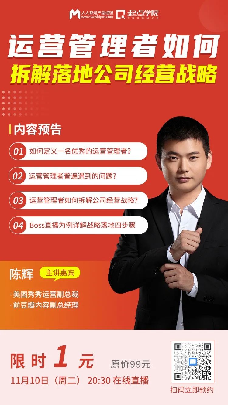 为了帮助3年以上的运营人更好地掌握拆解落地公司经营战略这项运营管理岗的核心能力,人人都是产品经理社区&起点学院准备了一场运营管理者公开课。