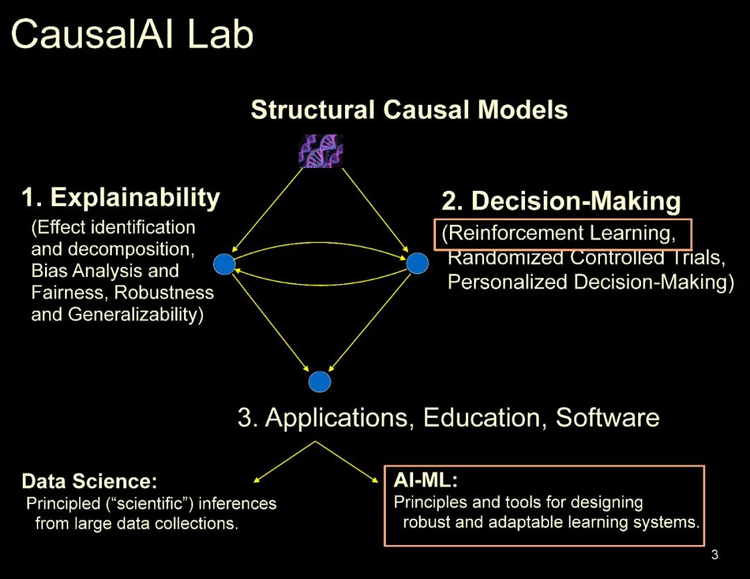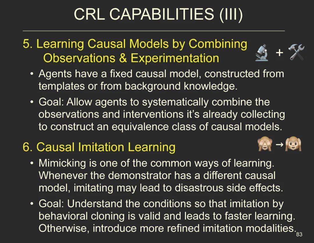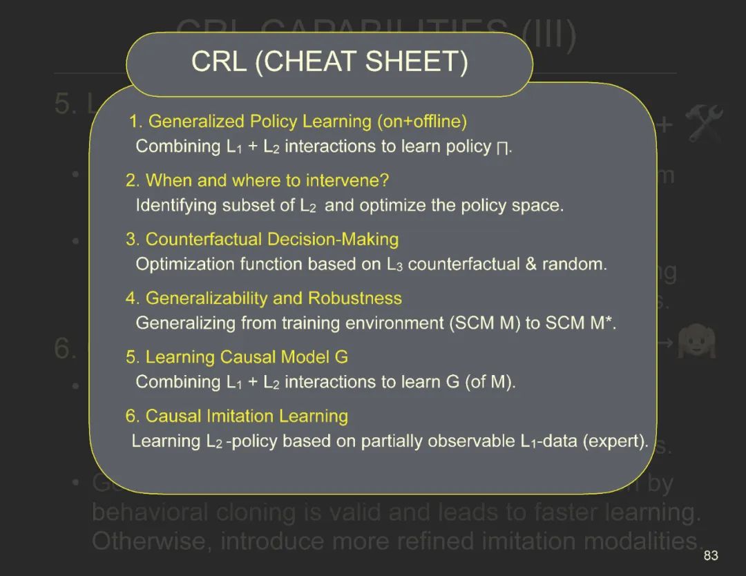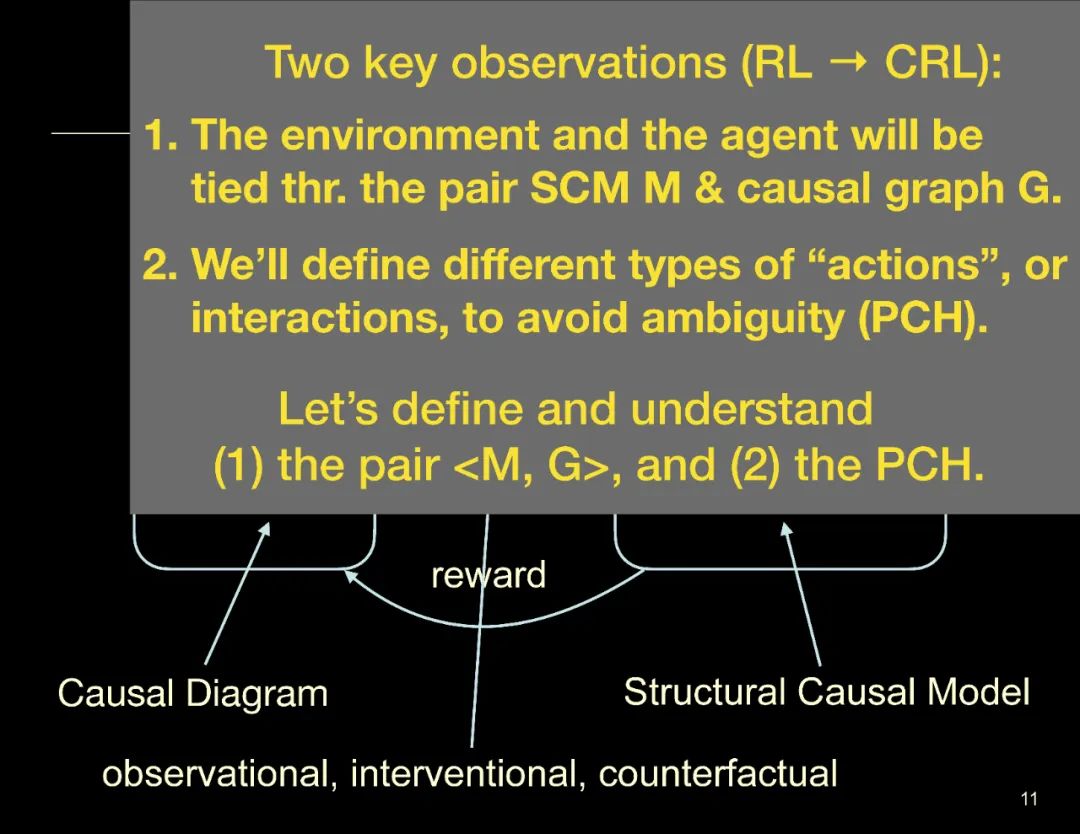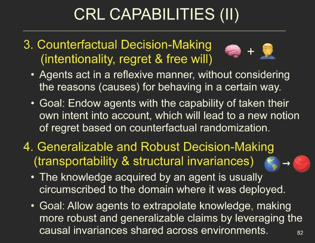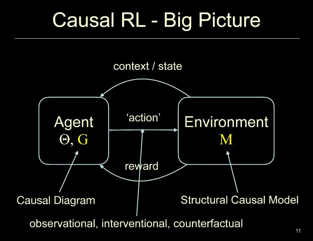 在本教程中,我们将基于这一观察结果引入统一的处理方法,并将这两个学科置于相同的概念和理论框架下。我们表明,当这一联系完全建立时,就会出现许多自然的和普遍的学习问题,而这不能单独从任何一个学科中看到。特别地,我们将讨论广义策略学习(在线、非策略和做微积分学习的组合)、何时何地干预、反事实决策(自由意志、自主、人与人工智能协作)、策略通用性和因果模仿学习等等。这种新的理解导致了对什么是反事实学习的更广泛的观点,并暗示了因果关系和强化学习并行研究的巨大潜力。我们称这种新的研究为“因果强化学习”(简称CRL)。