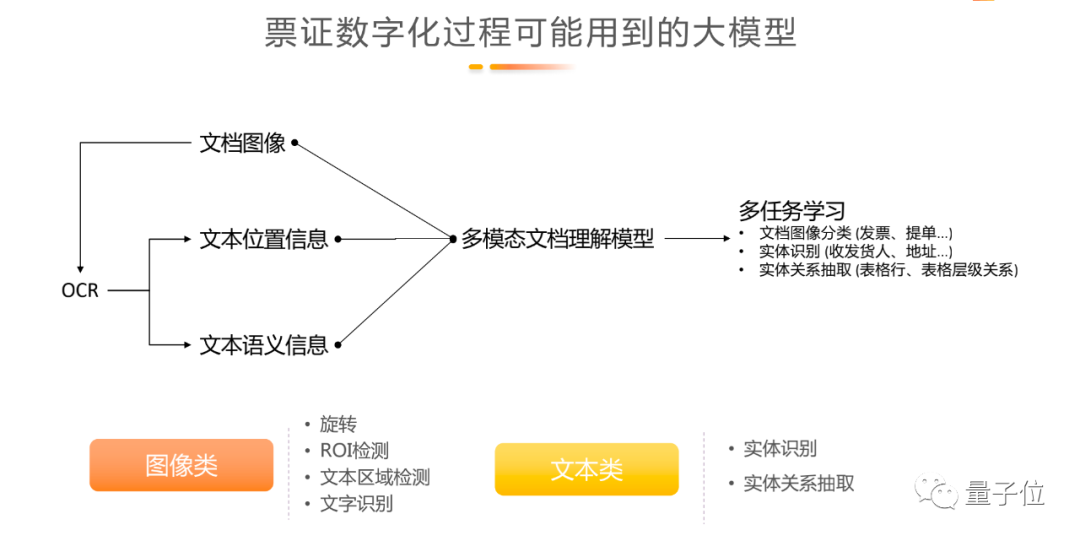 对应到大模型中,所需要调用的图像类模型功能有旋转方向、ROI检测、文本区域检测和文字识别,将文本区域内的信息转化为具体的字符。文本类模型的功能包括实体识别和对应关系的抽取。