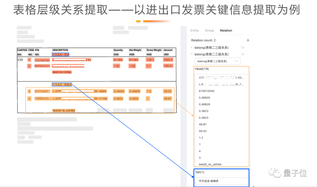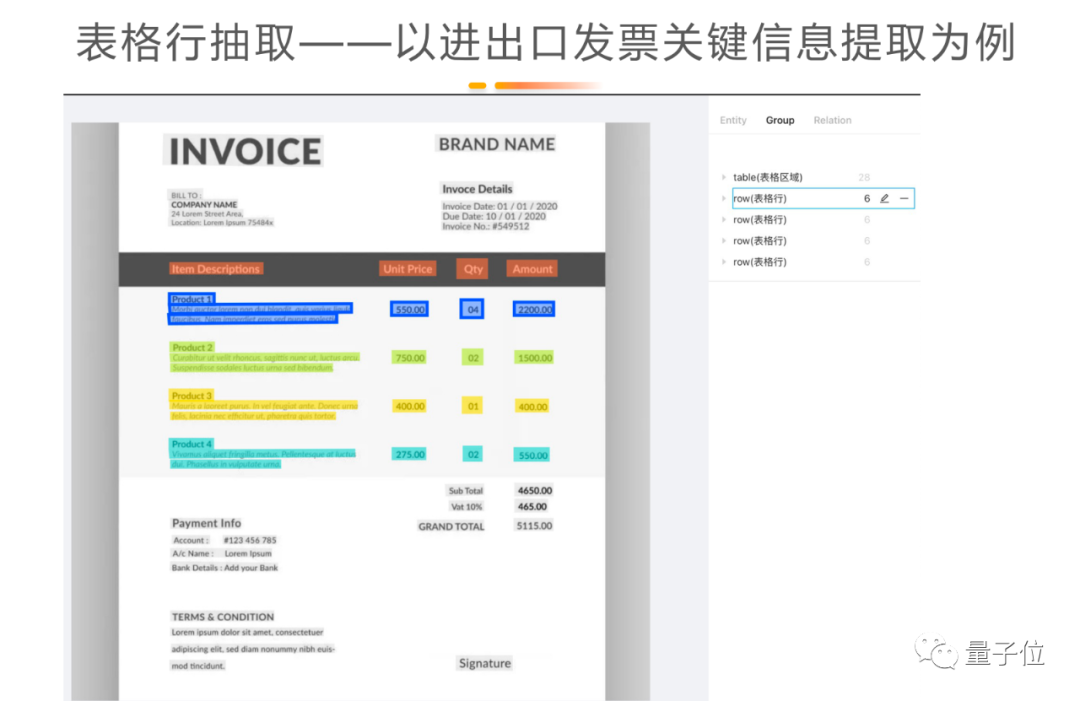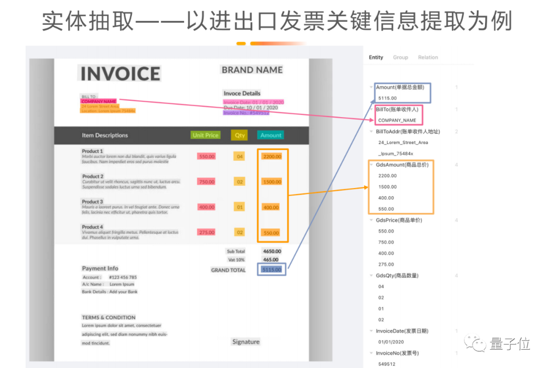 例子左上角是客户的名字和地址,表格中标明了具体的什么货物、多少钱以及总价。模型通过实体抽取就可以将其变成单个字段,抽取具体的“值”。这张INVOICE里包含一些逻辑关系的表格的,这个关系也需要用大模型加小数据做训练来提取。