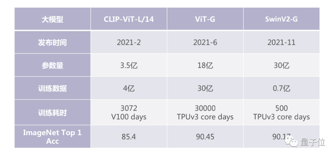 这里列的是2021年的三个模型都是在图像领域ImageNet公开、公认的标准数据集上面做图像分类的准确率,参数量都是几十亿的规模,训练数据也需要上亿,训练耗时、所需要的硬件资源都非常充足。将这样的大模型运用到新的具体应用场景完成图像分类或是物体检测的问题,只需要小规模的样本,也能快速得到好结果。