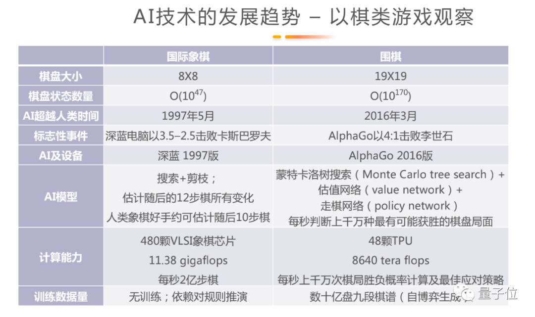过去的20年中,其一计算算力得到了极大的提升,其二所需要的芯片数量大幅降低,意味着耗电减少,其三是现在的模型可以离线训练,用大量的数据支持它做到对棋面的判断。基于此实现了人类国际象棋AI到围棋AI的突破,也支持了后续自然语言处理、图像识别等领域的进展。