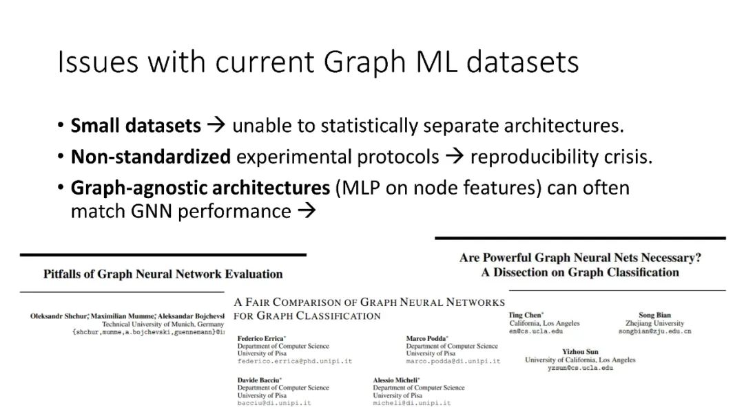 近期的大量研究已经让我们看到了图神经网络模型(GNN)的强大潜力,很多研究团队都在不断改进和构建基础模块。但大多数研究使用的数据集都很小,如 Cora 和 TU。在这种情况下,即使是非图神经网络的性能也是可观的。如果进行进一步的比较,使用中等大小的数据集,图神经网络的优势才能显现出来。
