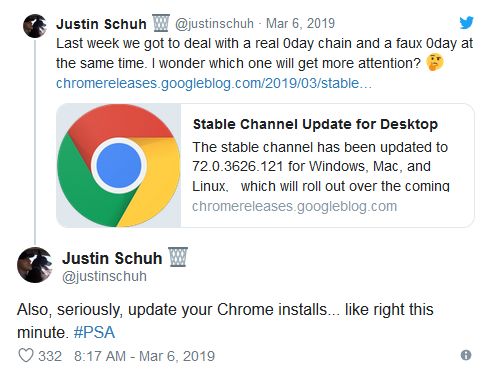 谷歌更新了该补丁的公告,明确表示 Chrome 的攻击方法已经“在外流传”。 Google Chrome 安全主管贾斯汀·舒赫(Justin Schuh)向 Twitter 发布了有关该漏洞存在的建议,并督促用户尽快使用新补丁更新浏览器。