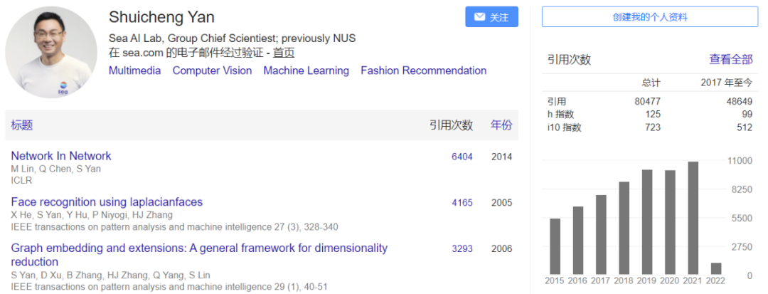 颜水成的主要研究领域涉及计算机视觉、机器学习和多媒体分析。到目前为止,他已经在顶级国际学术期刊和会议上发表超过 600 篇论文,H 指数为 125。2014 至 2020 年,他已经 6 次入选「Thomson Reuters 全球高被引学者」(2017 年除外)。