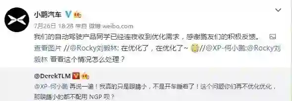 7 月 26 日晚,小鹏汽车在官方微博回应:自动驾驶方面的同事已经连夜收到了优化需求。
