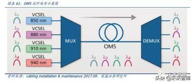 OM5光纤同时支持未来的 400G 以太网,对于更高速的 400G 以太网应用比如 400G Base-SR4.2(4 对光纤 2 个波长,每个通道采用 50G PAM4)或者 400G Base-SR4.4(4 对光纤 4 个波长,每个通道采用 25GNRZ),只需要 8 芯 OM5 光纤。