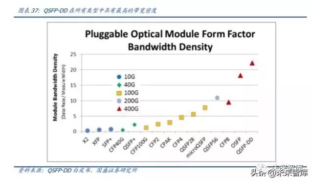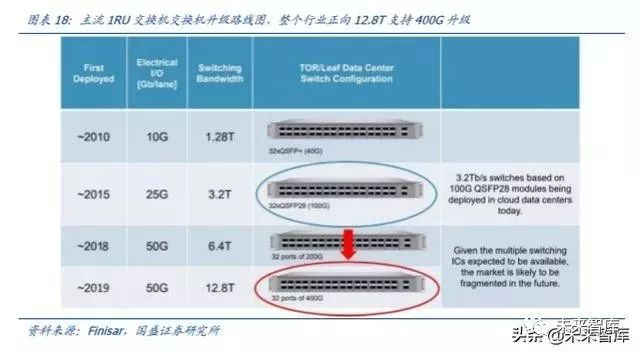 我们参考 Googe 数据中心升级路线,谷歌在 2013 年第五代数据中心谷歌开始启用 40G,2016 年下半年则开始大规模使用 100G,以此类推 2019 年年底有望开启 400G 规模商用。