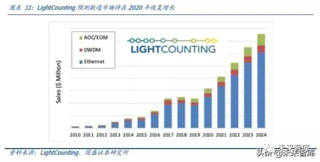 海外数据中心光模块专业咨询机构 LightCounting于 2019 年 4 月发布光通信市场预测报告,其中上调了对于以太网段光模块销售收入预测,主要原因是 100G 光模块的销量在增长,同时认为 Facebook F16 数据中心新网络架构对于相同数量的服务器,它需要 3-4 倍的 100G 光学器件,整个数据中心端口数量较之前有数倍增长,那么当 Facebook 开展 400G 升级进程后,对 400G 光模块需求量将会是巨大的。