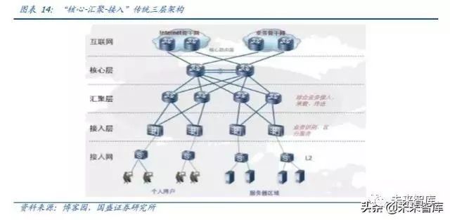 大型数据中心叶脊架构已成主流架构,新的交换模式可以带来更低的延时,传统三层架构退出历史舞台。首先大型云厂商在即将到来的 5G 时代,以及云进程的进一步深入加速,大型云厂商数据规模越来越大,数据中心内部东西向流量已然占据主导地位,更适于数据中心内部数据交互的扁平胖宽的叶脊架构已成为数据中心的首选。叶脊架构使得数据中心规模变得更大、更扁平化,这使得整个数据中心需要更多的交换机,交换机之间也需要更快的传输速率以及更高的光纤覆盖率来满足内部海量流量的互通。我们在近期国内市场的走访中已经越来越多听到关于叶脊架构的讨论。