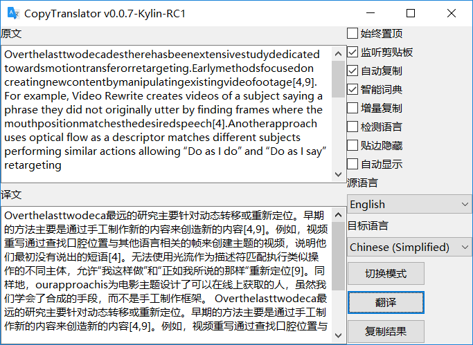 核心用法:打开网页或 PDF,Ctrl+C 复制要要翻译的本文,CopyTranslator 监听到剪贴板变化,会将剪贴板内容进行处理(如去除多余换行等),自动翻译,不用粘粘,并立刻给出结果。