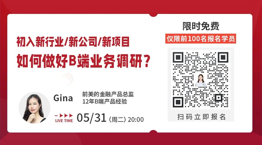 5月31(周二)晚8点,前美的金融产品总监@Gina老师在线直播,通过1个正确思维、2个落地方法,提高你的业务调研效率和质量。